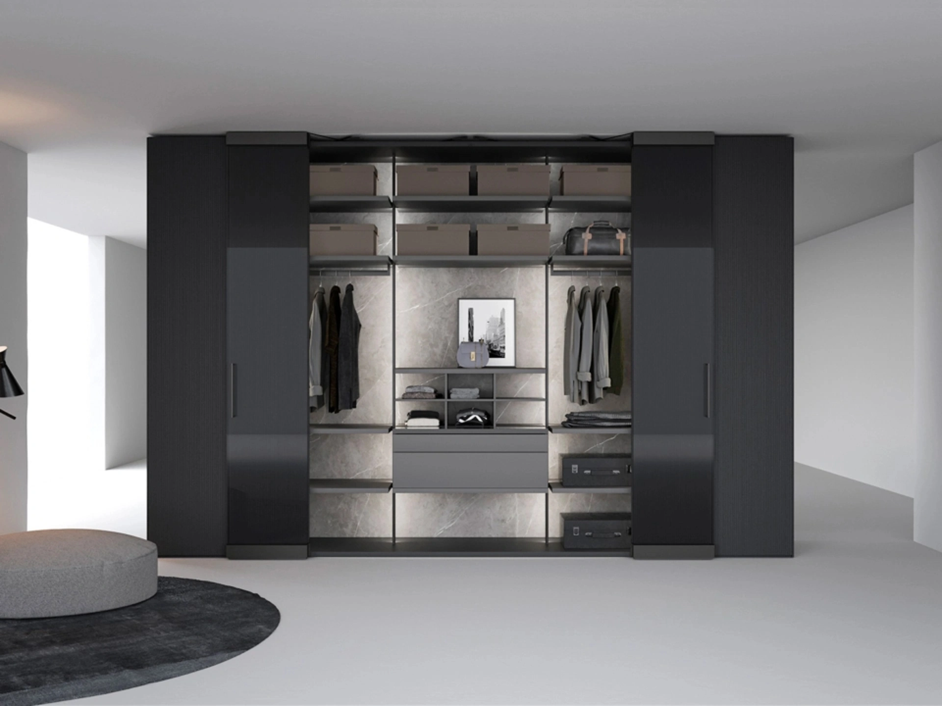 Eccoti l'armadio Freedhome Apertura Totale 50 vetro fumé in legno laccato di Caccaro! Un ricco catalogo di armadi a muro con ante a soffietto.