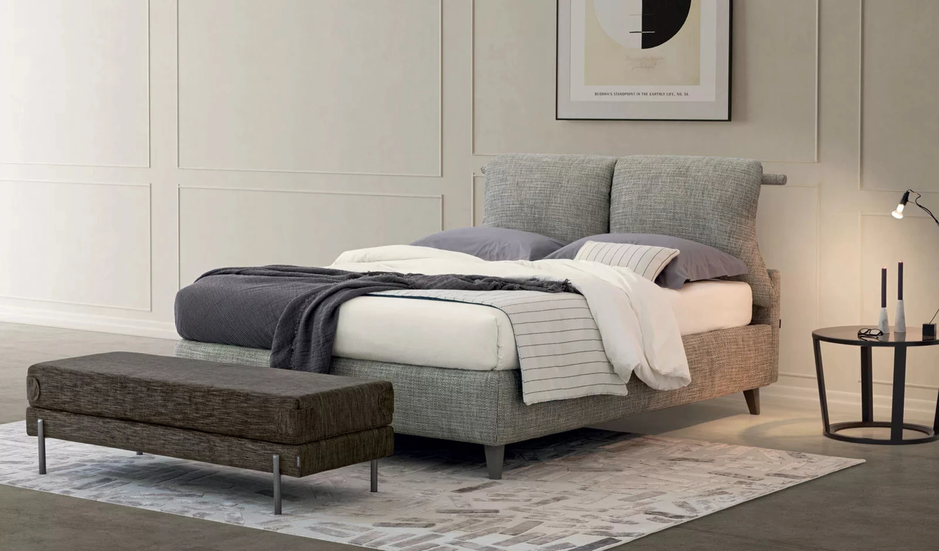 Il letto Pug in tessuto, tra i modelli con contenitore matrimoniali moderni di Oggioni, è perfetto per garantirti il sonno più profondo.