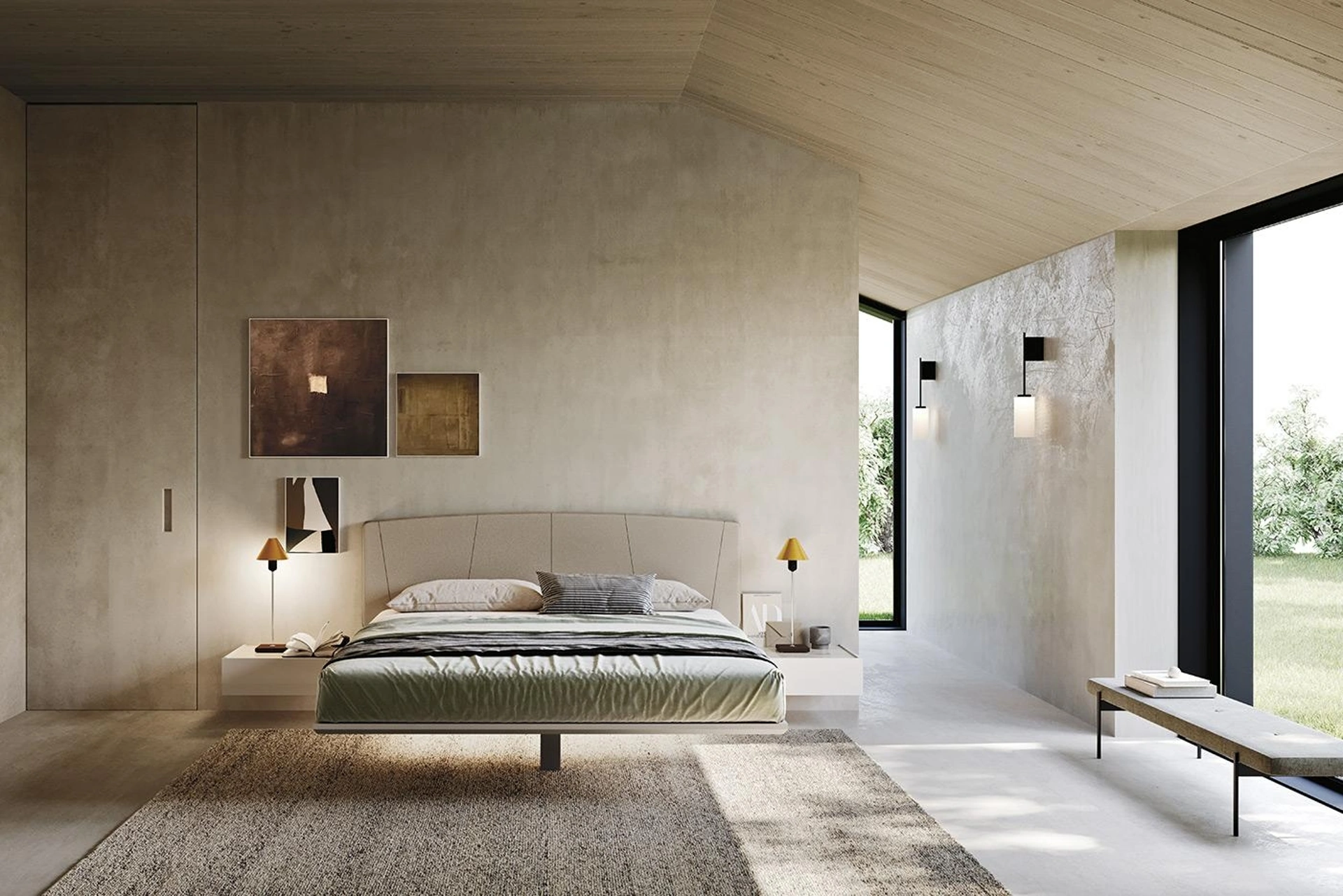 Il letto Sospeso N16 in tessuto, tra i modelli con testiera matrimoniali design di Mobilgam, è perfetto per assicurarti il sonno più profondo.
